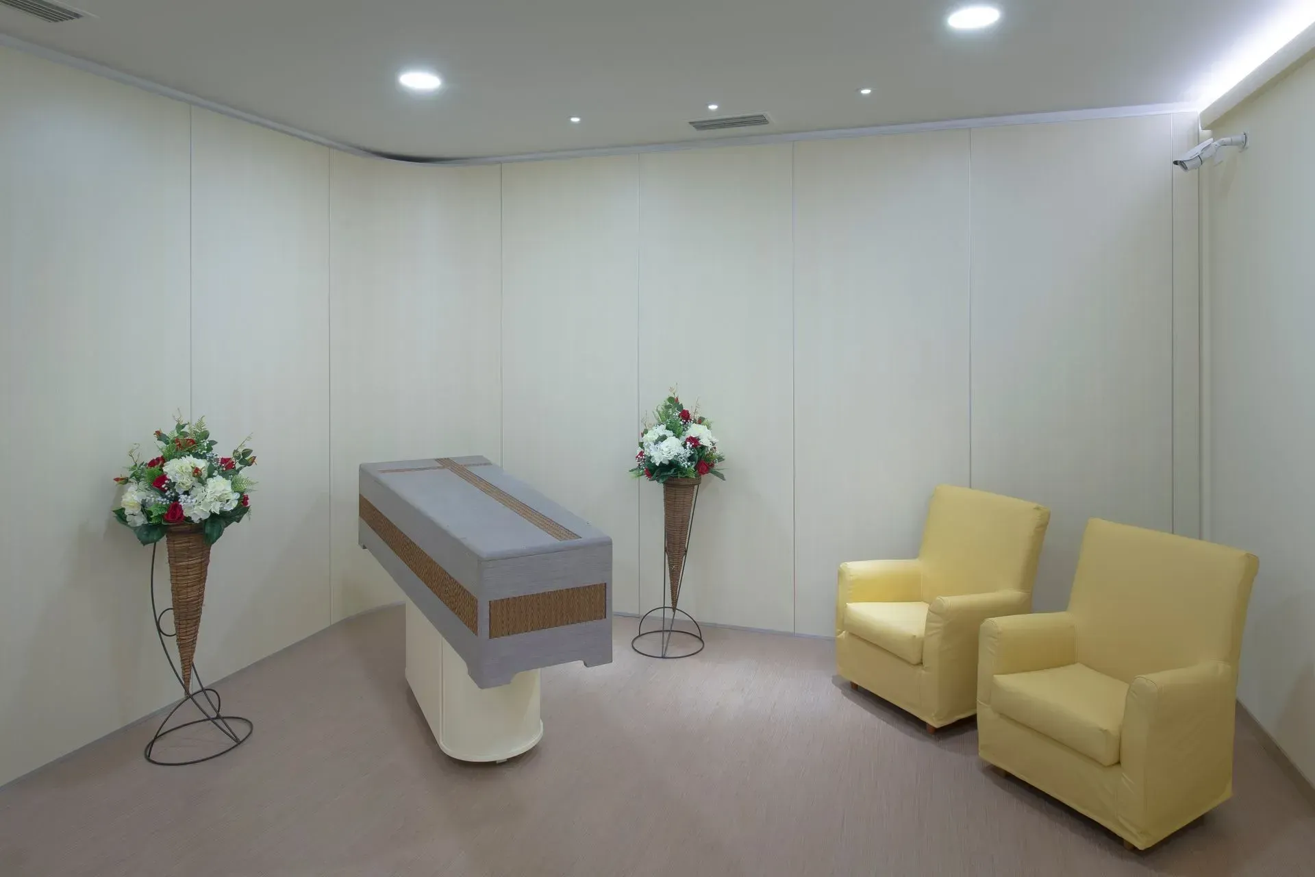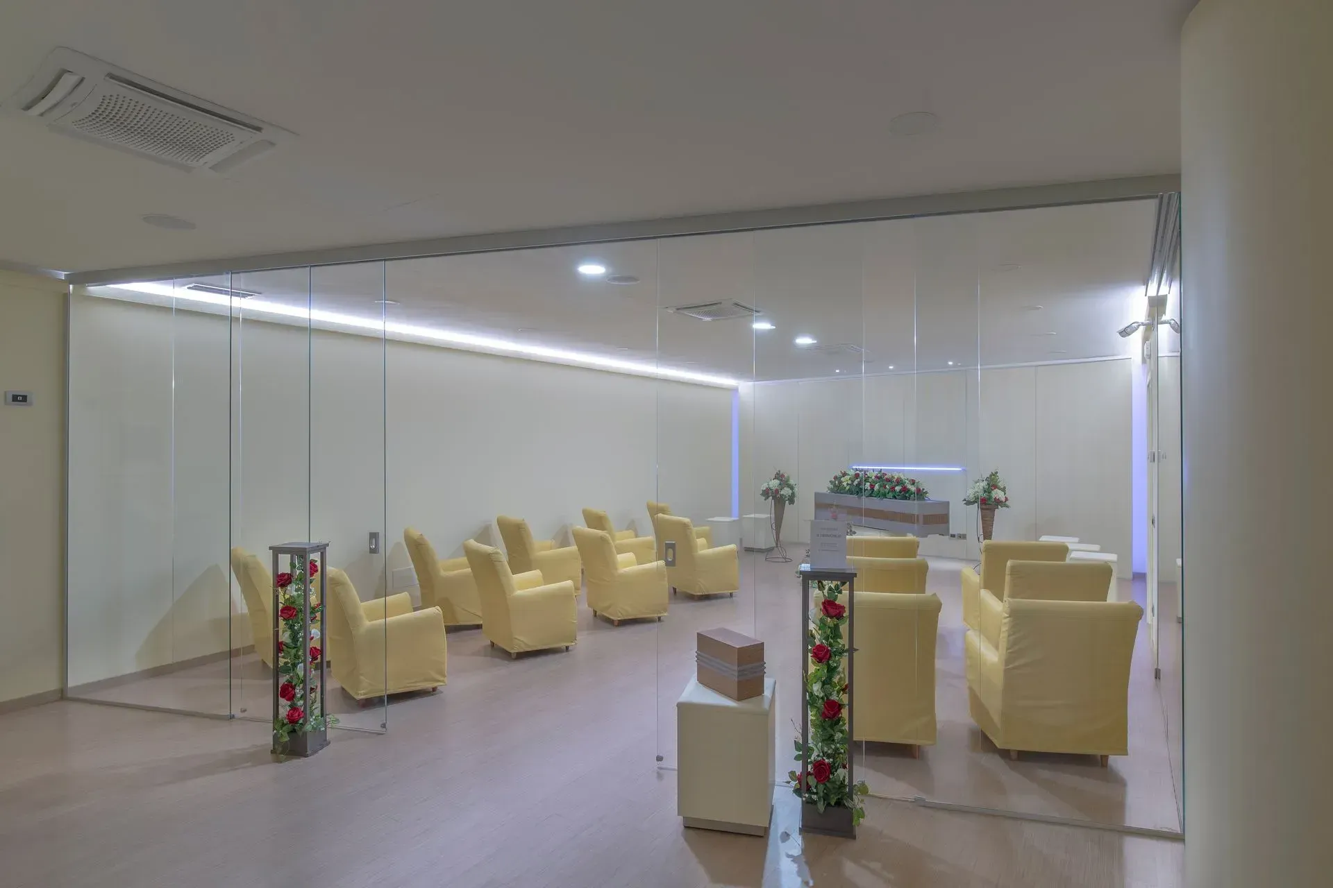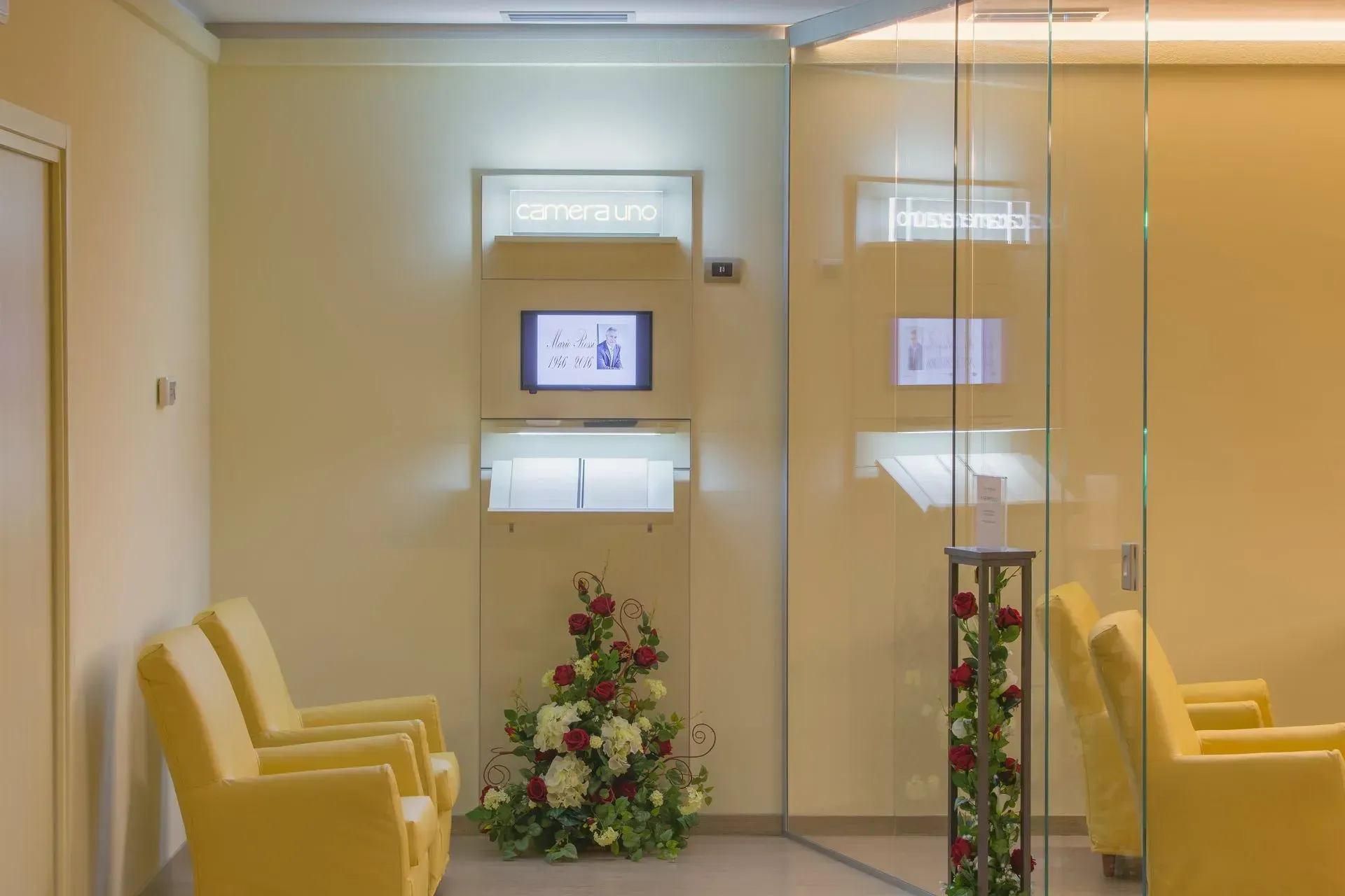 L’ambiente della casa funeraria è stato progettato per ricreare un clima di intimità e raccoglimento, lontano dalla freddezza dei contesti ospedalieri. Le tonalità neutre degli arredi, l’illuminazione soffusa e la disposizione armoniosa dei fiori contribuiscono a trasmettere serenità e rispetto.