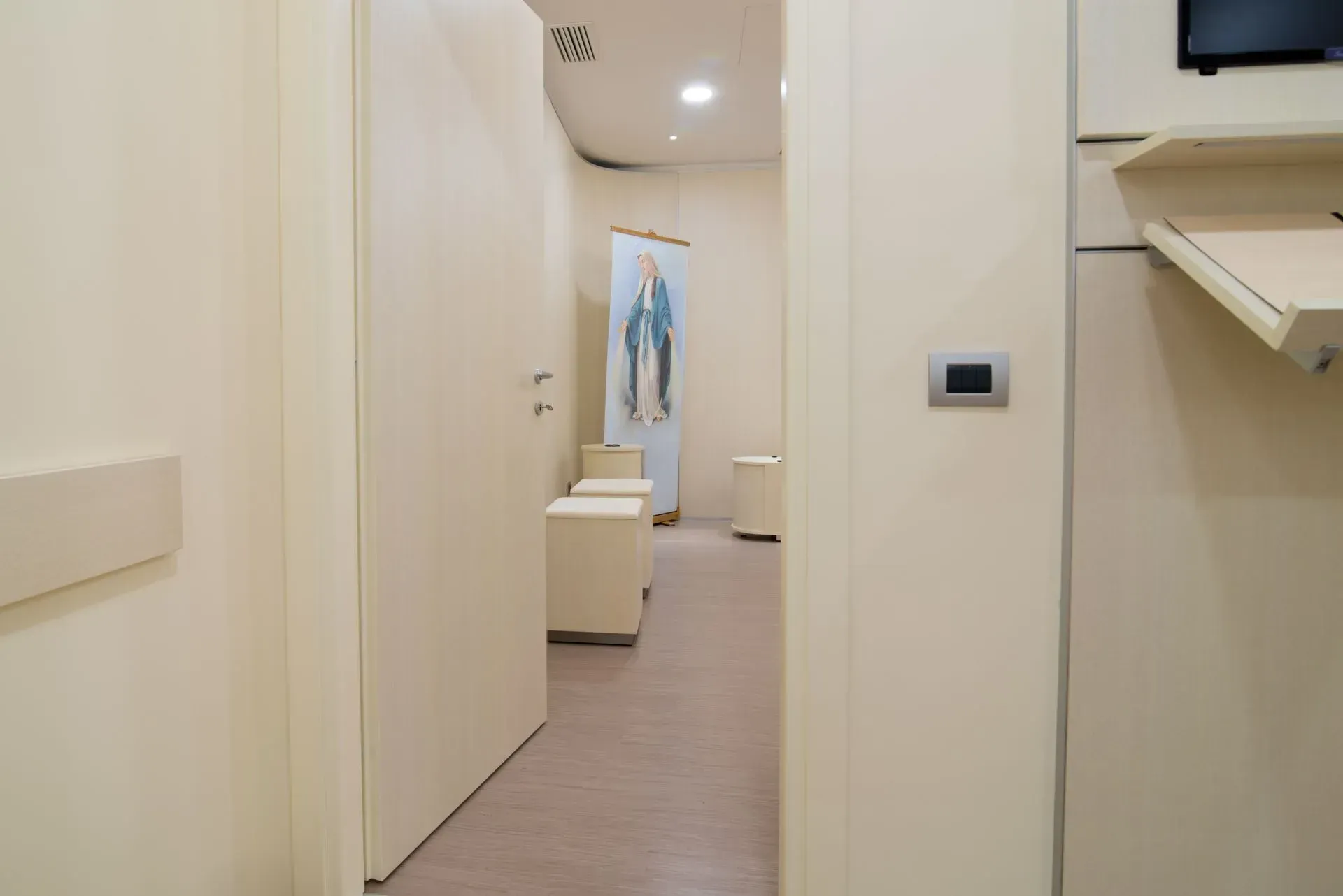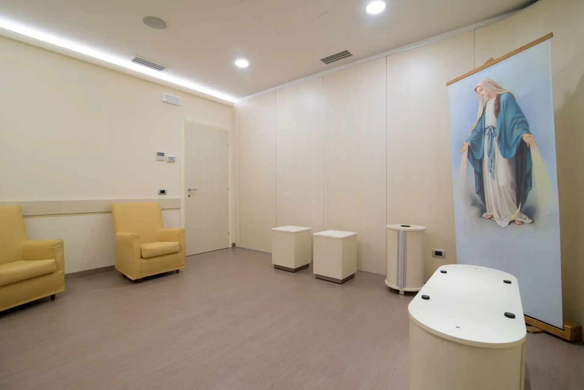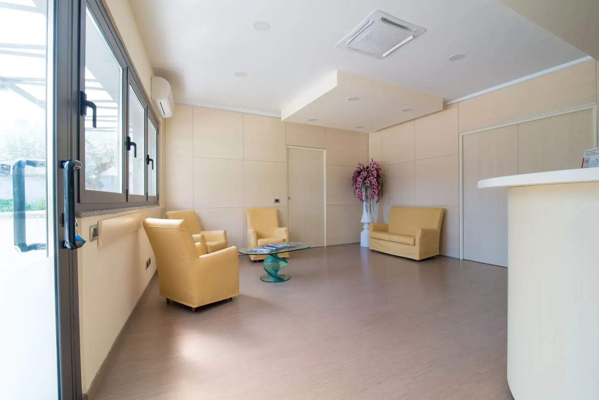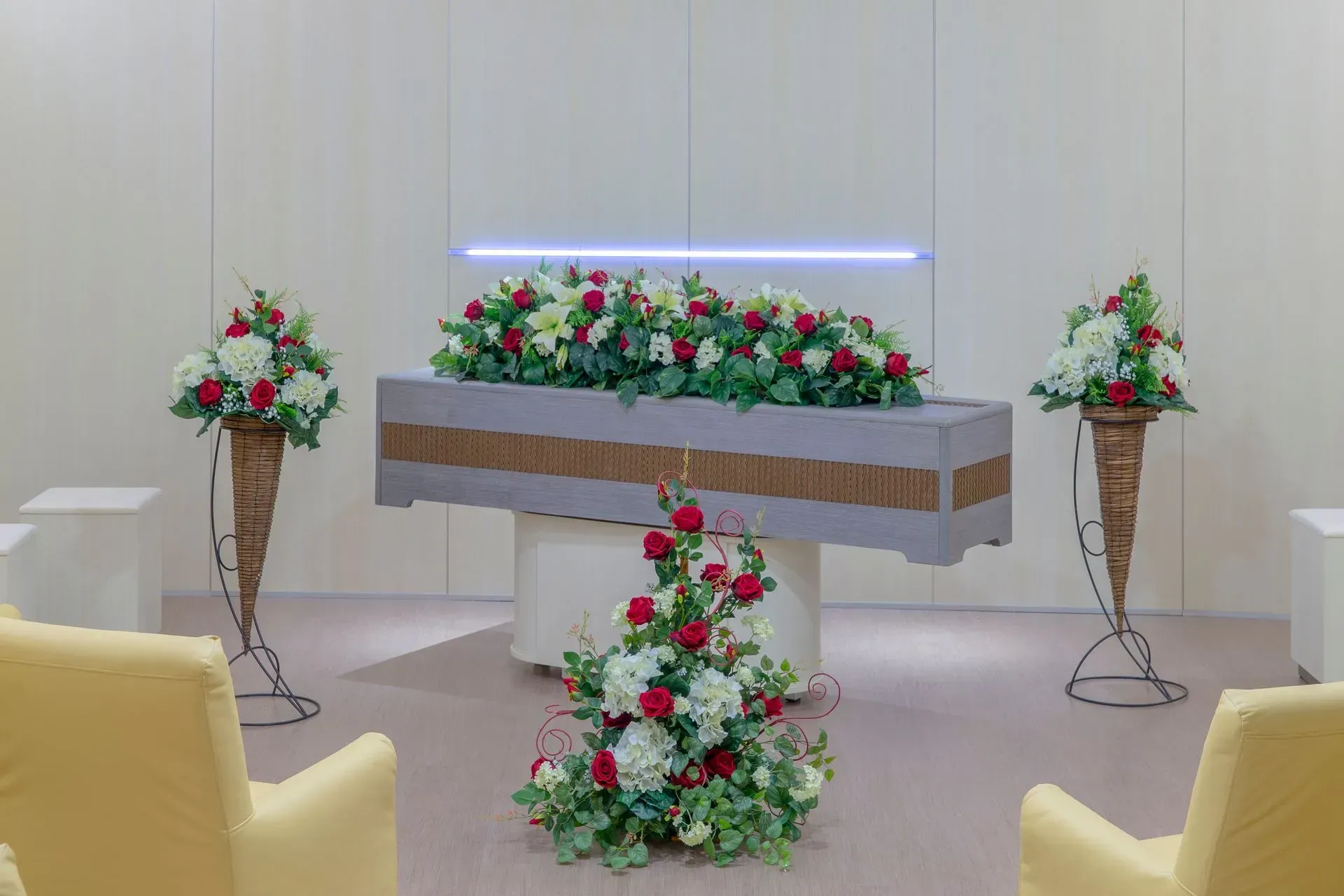 L’ambiente della casa funeraria è stato progettato per ricreare un clima di intimità e raccoglimento, lontano dalla freddezza dei contesti ospedalieri. Le tonalità neutre degli arredi, l’illuminazione soffusa e la disposizione armoniosa dei fiori contribuiscono a trasmettere serenità e rispetto.